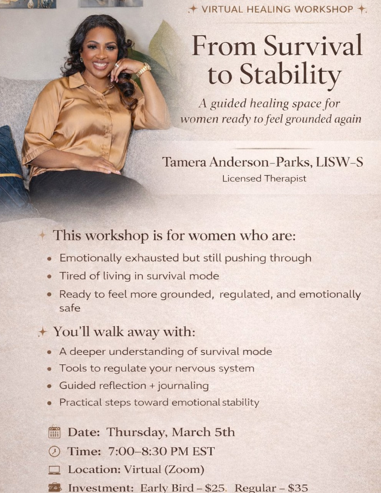 This workshop is led by Tamera Anderson-Parks, a licensed therapist who specializes in emotional wellness, trauma, inner child healing, and helping women move out of survival mode and into steadiness.